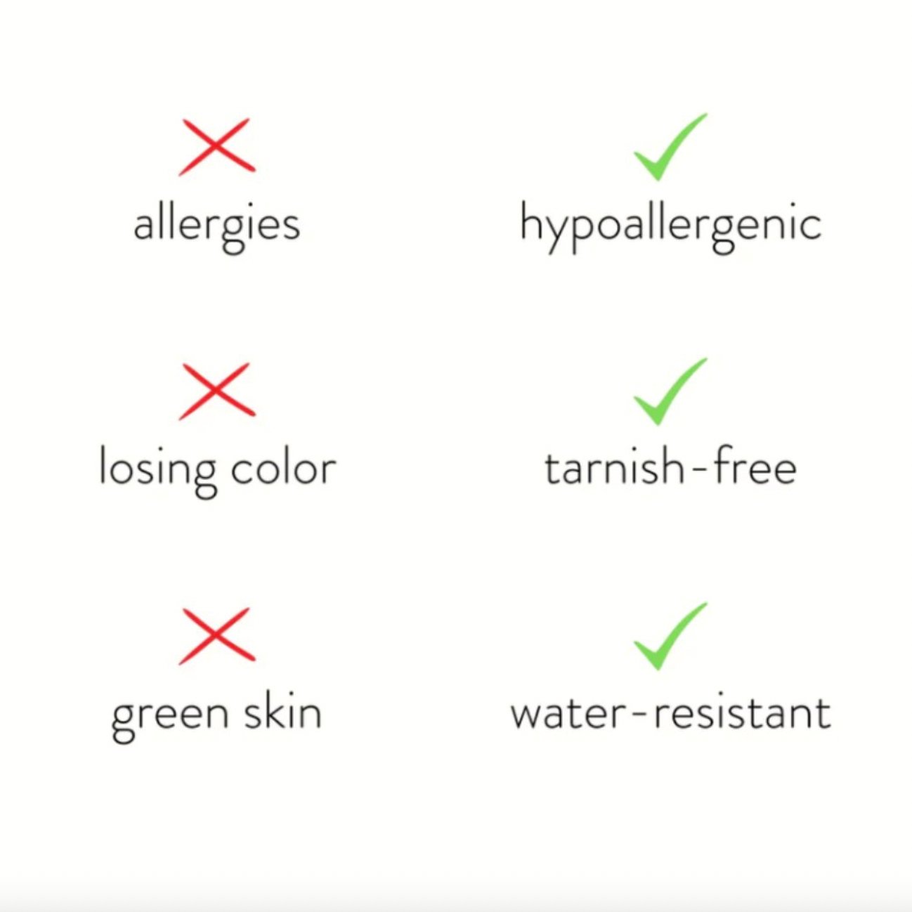 Tillverkat av vattentåligt rostfritt stål, behöver du aldrig oroa dig för att smycken ska blekna eller bli oxiderade igen.